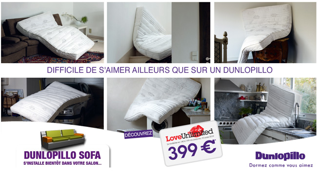 Dunlopillo 27 janvier 2010C'est bon ça ! 2Difficile de s'aimer ailleurs que sur un Dunlopillo Me rappelle un peu la campagne axe dans la neige… Aime bien ! http://www.dunlopillo.fr/ Article précédent Alice is dead Article suivant Buggy Rollin