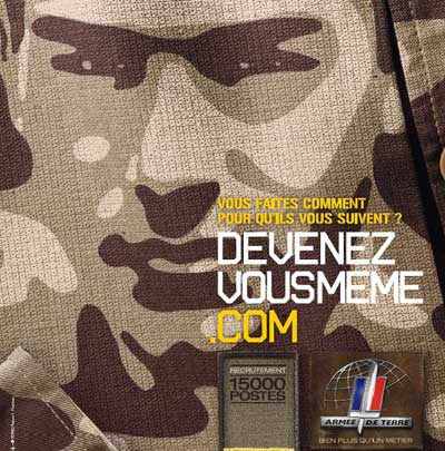 « Devenez vous-même » est le thème de la nouvelle campagne de recrutement de l’armée de Terre lancée ce mercredi 03 février 2010 par le général d’armée Elrick Irastorza, chef d’Etat-major de l’armée de Terre (CEMAT). Dans un contexte fragile où plus que jamais les jeunes se posent des questions sur leur employabilité et le sens qu’ils veulent donner à leur vie professionnelle, l’armée de Terre renforce sa marque employeur au travers d’une campagne de communication de recrutement innovante et de très grande ampleur, jouant la carte de la proximité, du réalisme et de l’authenticité.