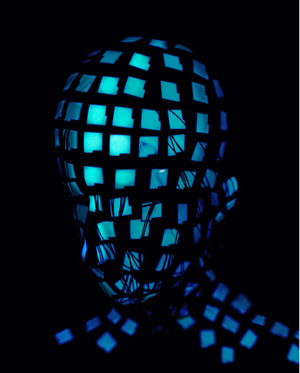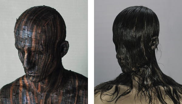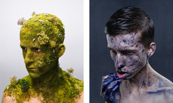 Toujours pris de trois quart face et les yeux baissés dans le vide, son visage devient le lieu d’une création. Il est habillé, sculpté, de matières.