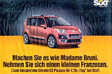 Sarko, égérie publicitaire 28 avril 2010C'est bon ça !Humour allemand. Une pub allemande pour Sixt : “Faites comme madame Bruni. Prenez un petit Français.” Article précédent Ephemicropolis Article suivant Ping pong…
