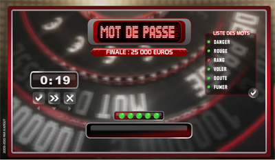 Mot de passe 4 mai 2010C'est bon ça !Un ptite partie entre amis ? Version non officielle développé par un certain Kapout… Pas si facile que ça de choper les 25 000… http://motdepassetv.com/ Article précédent Adrian Tranquilli Article suivant Zoom quilt II