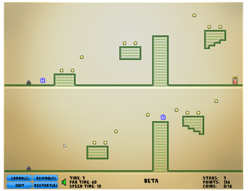 Là où il apporte une nouvelle dimension, c’est dans la scission des niveaux de jeu. En effet, les niveaux sont doublés (parfois plus) à l’écran de telle sorte que, si un endroit d’un niveau n’est pas atteignable dans la partie haute du niveau, vous pourrez l’atteindre en utilisant la partie basse puisque les déplacements de votre petit robot sont à l’identique en haut et en bas…