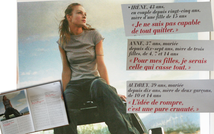 2° Autre choix de photo qui m’a interpellée, celui consacré aux femmes qui restent avec un homme malgré l’usure du quotidien et le manque de passion. Ici, Marie-Claire fait appel aux témoignages de plusieurs femmes (Irène 43 ans, Anne 37 ans et Audrey 39 ans).