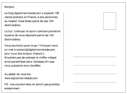 Voilà l’idée : digital marmelade a fait imprimer 100 cartes postales que vous pouvez découvrir ci-dessous :