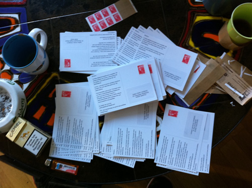 Ces 100 cartes postales seront expédiées (avec vrai timbre) à 100 personnes, tirées au hasard et réparties dans les 10 plus grandes villes de France, le 1er novembre 2010.