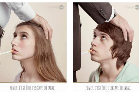 Voilà la dernière campagne de l’association “Droit des non fumeurs” : trois affiches montrent des ados à genoux devant un homme en costume, le sexe étant ici remplacé par une cigarette…
