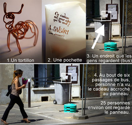 Mais ce n’est pas ce qui nous a le plus interpellé. Ce qui nous a le plus interpellé, c’est qu’elle fait des petits happening de rue en déposant par exemple des petits cadeaux pour les passants et observe comment ceux-ci vont réagir :