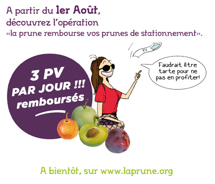 Les producteurs de prunes, pas de PV hein mais l’Association d’Organisations de Producteurs Nationale (AOPN) Prune, ont eu une idée plutôt sympathique pour faire leur promotion : profiter de cette mauvaise nouvelle pour communiquer en faisant gagner sur leur site des chèques de 17 euros (soit l’équivalent d’une prune de stationnement). Bien vu non ?