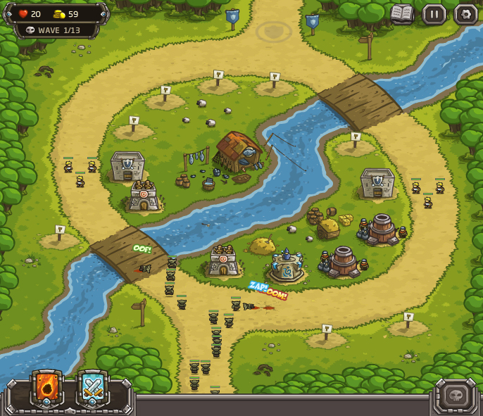 _ Faire évoluer plus rapidement les tours à gros débit (archers, magie) à proximité de leur points d’entrée, tout en assurant les arrières. _ Puis faire évoluer les canons pour permettre des frappes massives sur les grosses vagues finales, bloquées par mes troupes de fantassin.