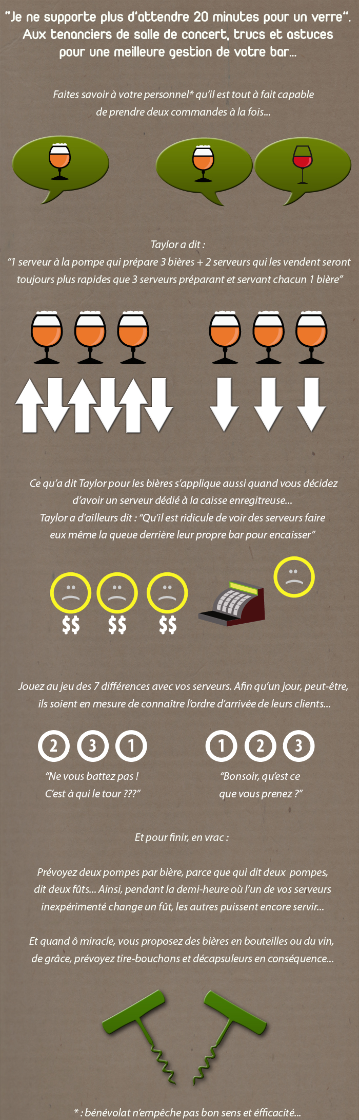“Je ne supporte plus d’attendre 20 minutes pour un verre”. 24 novembre 2012Tout fout l'camp ! 1Aux tenanciers de salle de concert, trucs et astuces pour une meilleure gestion de votre bar... Article précédent Jazz VS Rock Article suivant Mashup Jack Nicholson Batman vs Shining